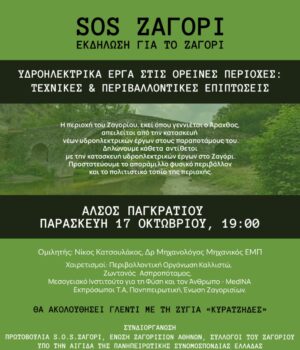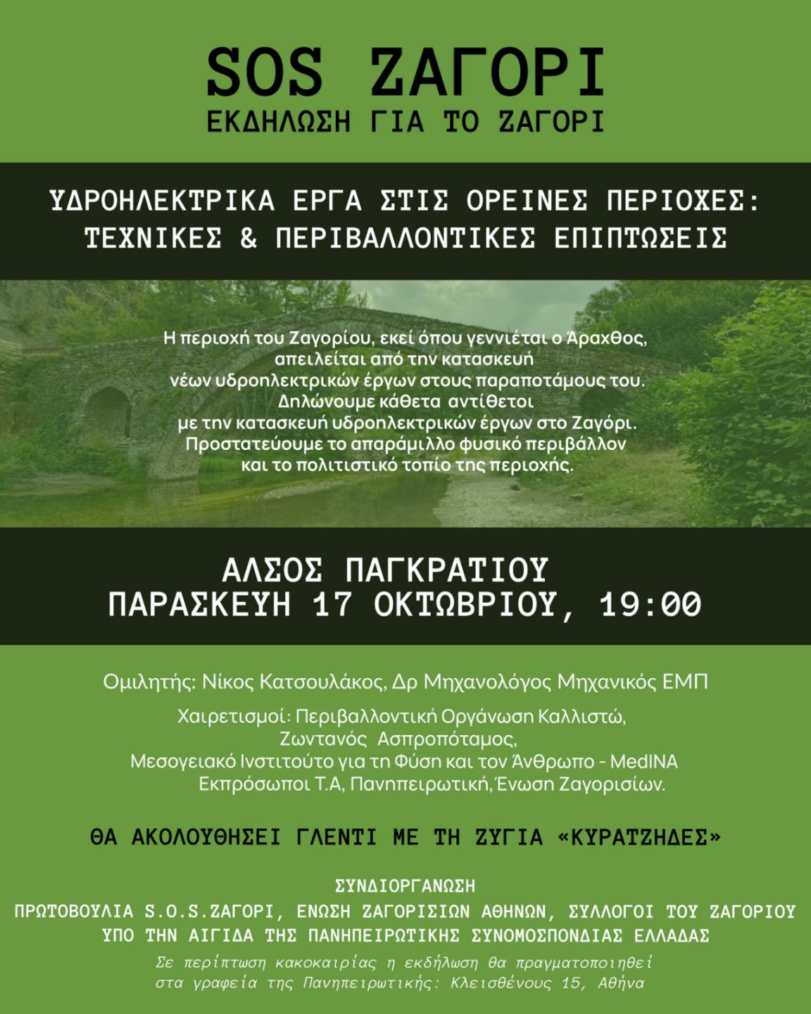 Η Ηπειρωτική Συσπείρωση έχοντας σταθεί εδώ και χρόνια στην πρώτη γραμμή των αγώνων ενάντια στην ανεξέλεγκτη εγκατάσταση ΑΠΕ στην Ήπειρο καλεί τους απόδημους Ηπειρώτες να συμμετέχουν στην εκδήλωση των κατοίκων και απόδημων του Ανατολικού Ζαγορίου ενάντια στην κατασκευή Υδροηλεκτρικών έργων στην περιοχή, σήμερα 17/10, στις 19:00, στο Άλσος Παγκρατίου.